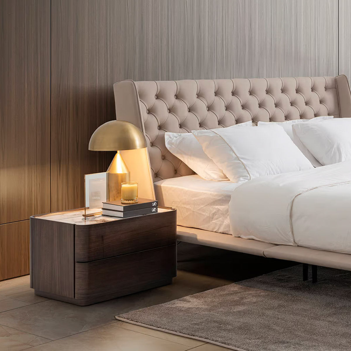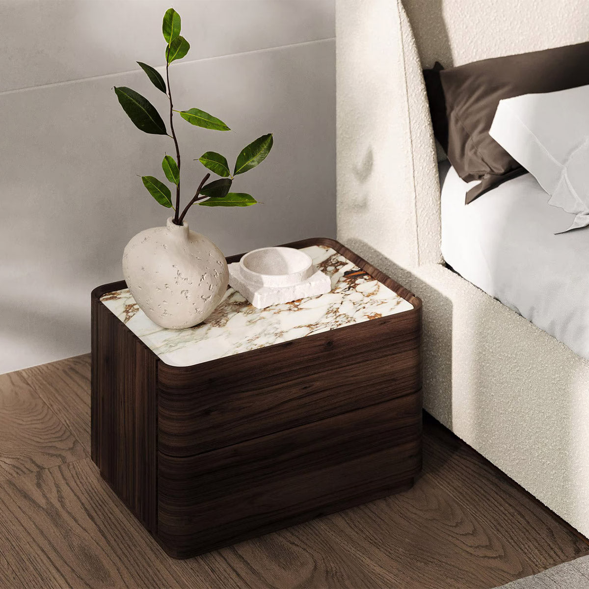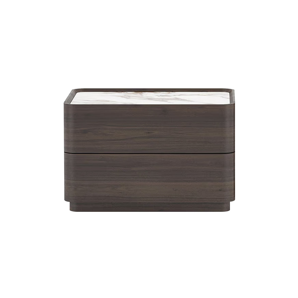 Arel es una elegante mesa de noche está confeccionada en madera walnut de tono marrón profundo, lo que le aporta una apariencia cálida y sofisticada. Cuenta con dos gavetas amplias, ideales para el almacenamiento, y su tope está revestido con un hermoso laminado de mármol blanco veteado, que añade un toque de distinción y modernidad a cualquier espacio.