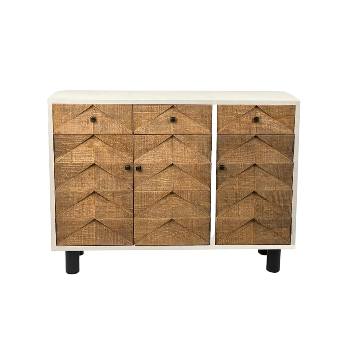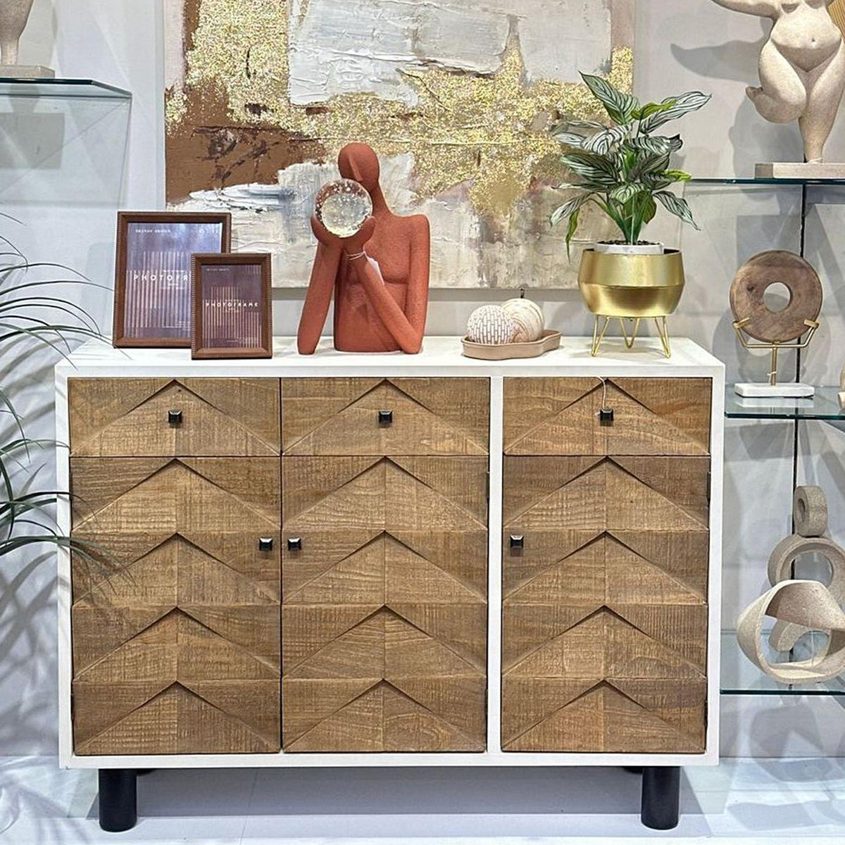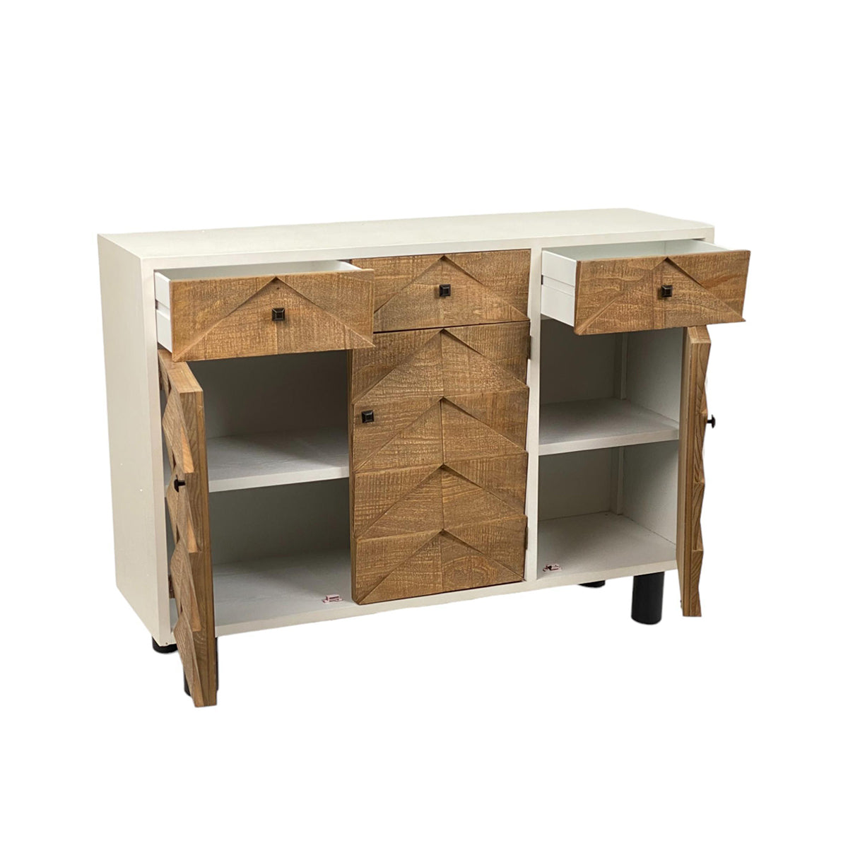 Gavetero de 3 gavetas y 3 compartimentos dobles. Su estructura es de madera walnut en color natural y revestimiento en color blanco.