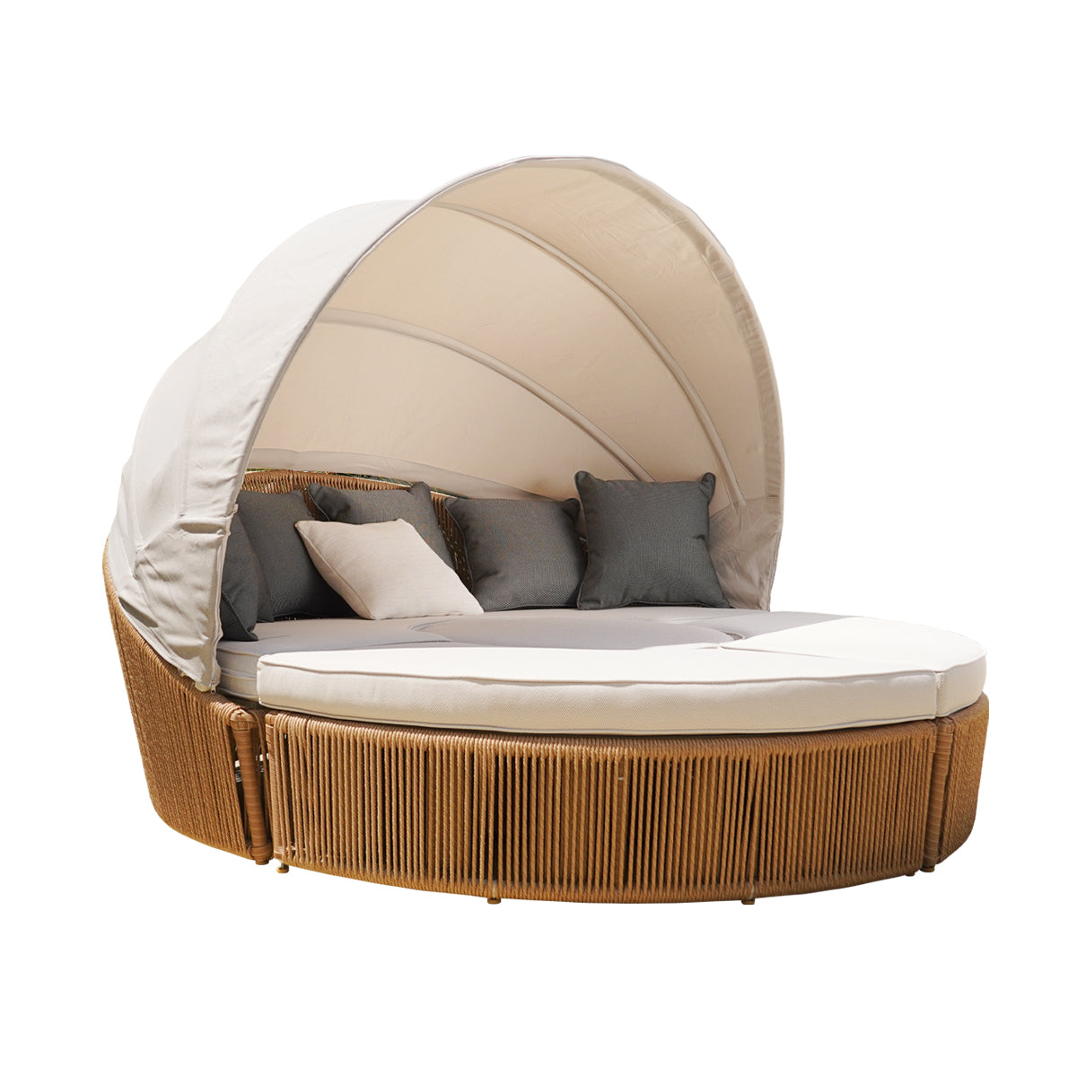 Su carpa retráctil en tela proporciona sombra ajustable para protegerte del sol según tus necesidades, mientras que sus asientos se pueden dividir en cuatro partes individuales, permitiendo múltiples configuraciones: desde una cama redonda completa hasta asientos separados para socializar.