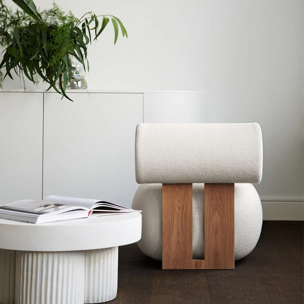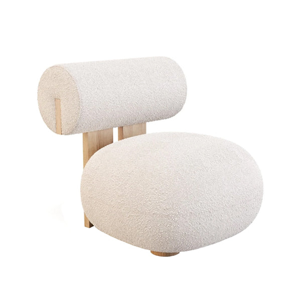 La butaca Hana se caracteriza por sus formas suaves en sentido curvo. Su espaldar y base se compone de una colcha suave, con un tapizado texturizado. Cuenta con una estructura en madera walnut, expuesta en la parte trasera y patas.