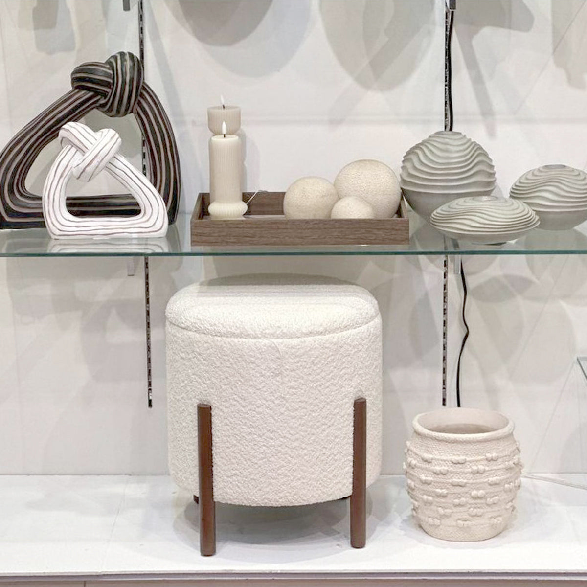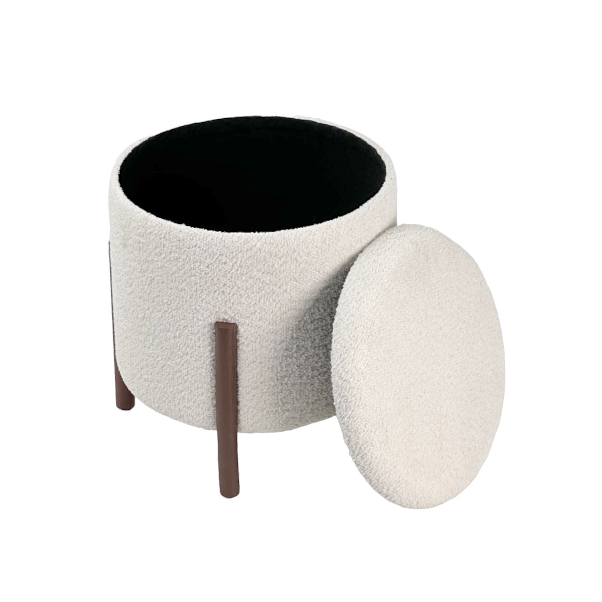 Ottoman cilíndrico tapizado en tela texturizada con espacio interior para almacenamiento.