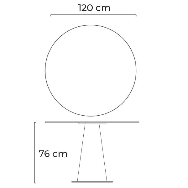 Mesa de comedor con tope redondo de cristal con laminado de color blanco. Cuenta con una semi base (entre el tope y el soporte) circular en madera y soporte vertical de metal color negro.